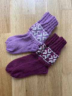 Bonusbarnbarnen beställde raggsockor med snöflingor, så det var ju bara att försöka lösa det! Jag utgick från strömsösockan men gjorde ett eget mönster som ska försöka föreställa snöflingor. Jag tror att tjejerna blev nöjda i alla fall!